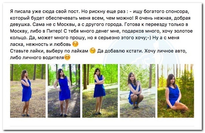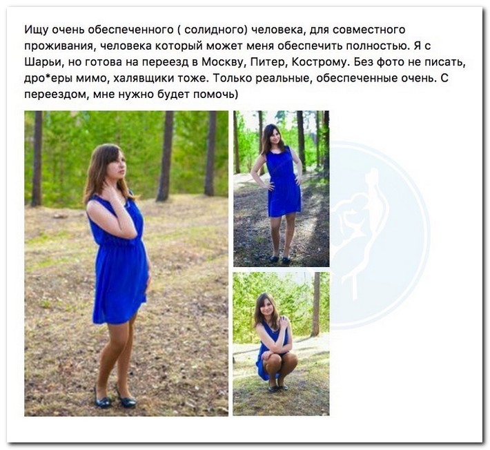 Насмотревшись кинофильмов, начитавшись книжек и неодинаковых историй из интернета, эта молодая барышня из города Шарья Костромской области постановила найти своего индивидуального олигарха. Искала она его в социальной сети, однако, судя по всему, настолько и не нашла, а потому постановила исподволь понижать планку.