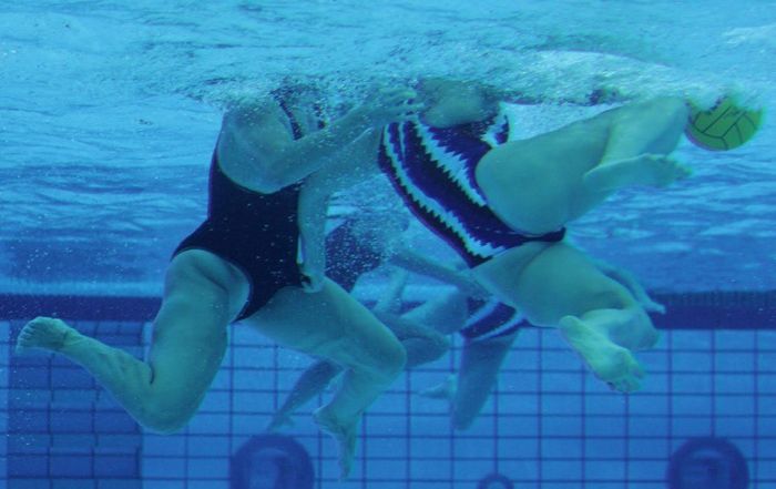 Спортсменки увлеченные игрой в водное поло не обращают внимание на оголенные участки своего тела.