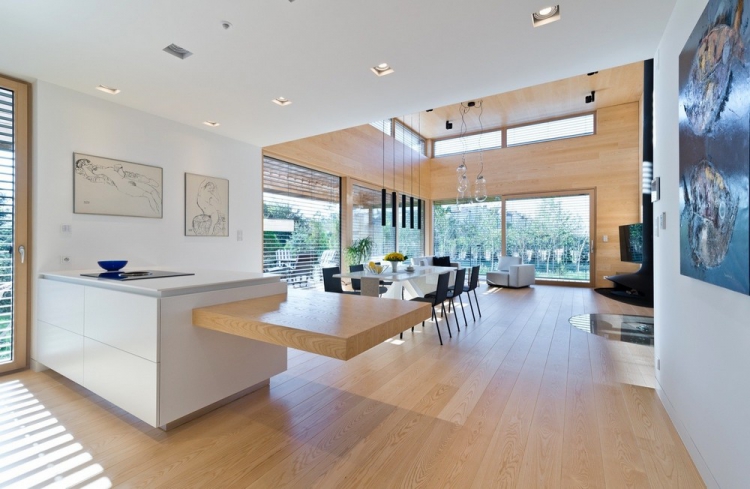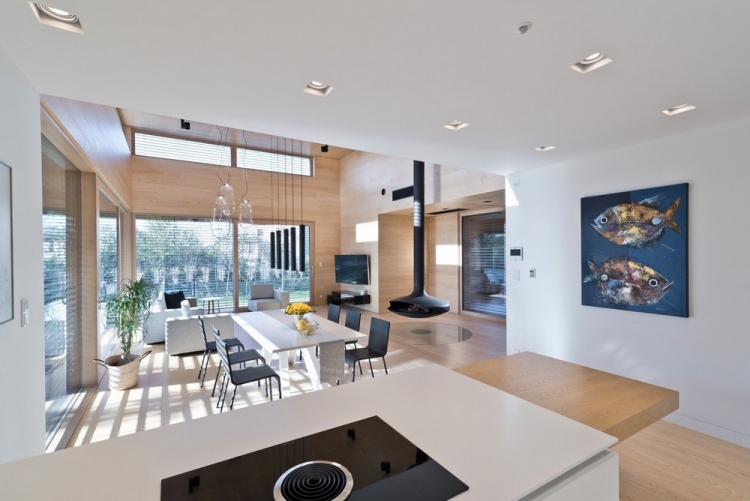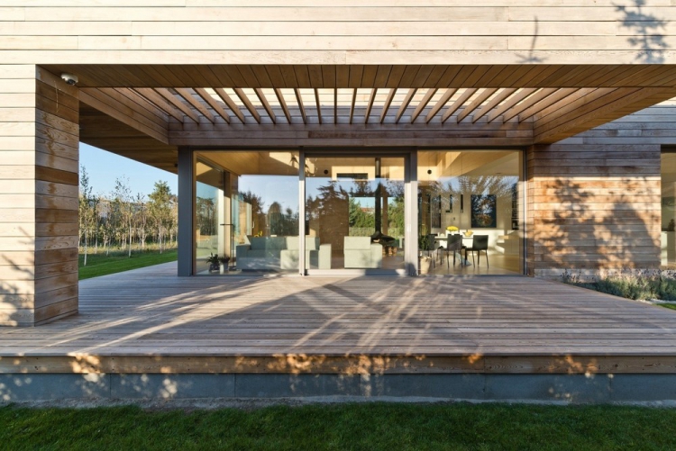 Резиденция выполнена одноэтажной и идеально продумана для жизни одного хозяина. Она тесно связана с садом и террасой для отдыха благодаря панорамному остеклению, обеспечивающему беспрепятственное проникновение внутрь потоков солнечного света. Исключение составляет лишь лицевая сторона здания, имеющая простой, компактный и замкнутый фасад. В интерьере резиденции царит тёплая цветовая гамма, наполняющая пространство спокойствием и внутренним равновесием.