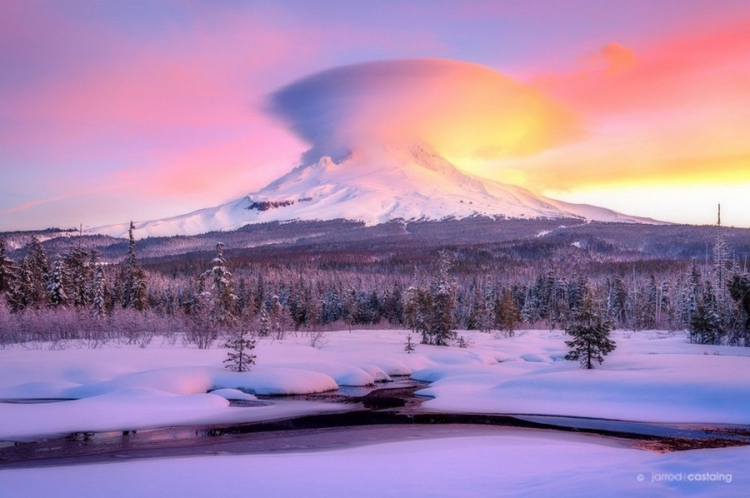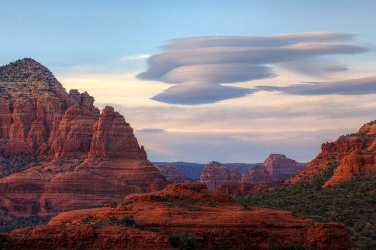 Лентикулярные (линзовидные) облака — одно из красивейших и достаточно редких явлений. Главная особенность этих облаков в том, что они остаются недвижимы даже при очень сильном ветре. Как правило, такие облака появляются с подветренной стороны горных хребтов, за хребтами и отдельными вершинами на высоте от 2 до 15 километров.