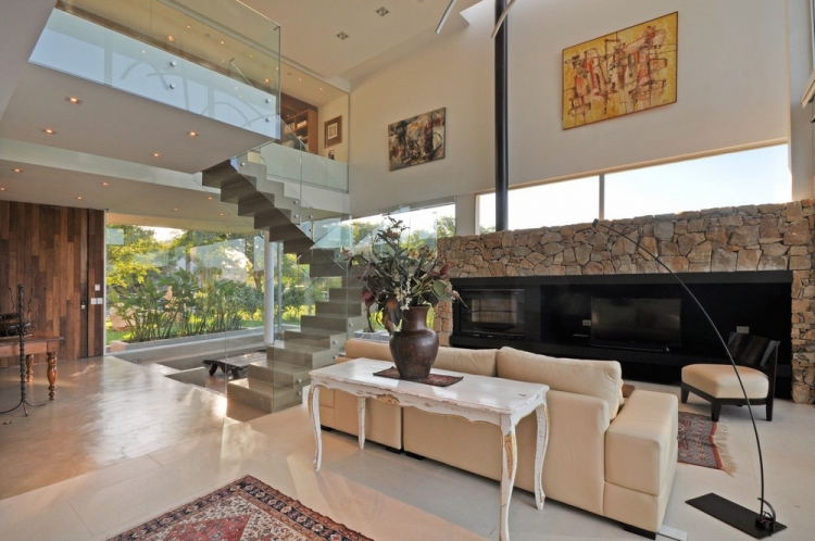 Дом состоит из двух этажей. На первом уровне находятся общественные пространства и зона обслуживания. В свою очередь, верхний этаж включает в себя спальни и рабочий кабинет. Гостиная ломает логику распределения пространства путём создания двухуровневого помещения с различными функциями, развивающимися по вертикали.
