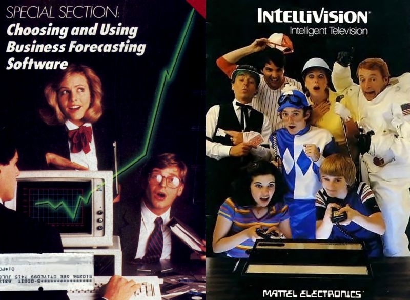 80-е года прошлого века стали прорывом в мире компьютерной техники. Электроника выбилась из цехов специализированных предприятий и вошла в жилые дома. Понятное дело, что до полноценного развлекательного формата было очень далеко, но производители в каталогах старались как можно сильнее преувеличить достоинства тогдашних персональных компьютеров и игровых консолей. Поэтому люди на фотках настолько восторжены, будто нашлось лекарство от рака или произошел долгожданный контакт с инопланетной жизнью.