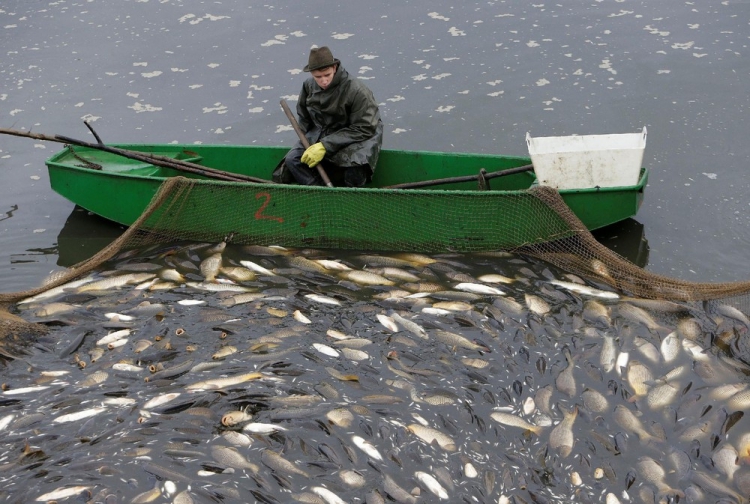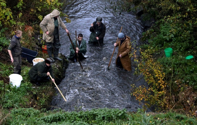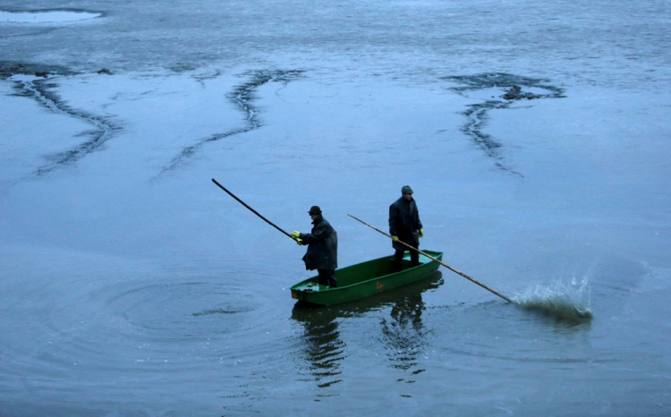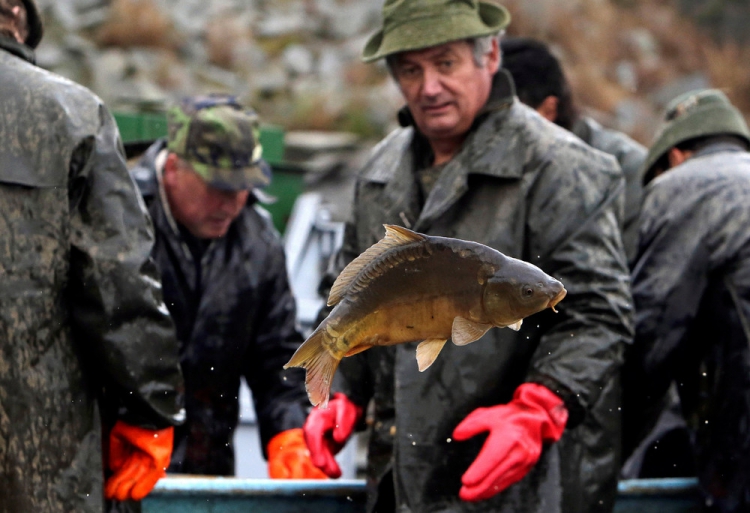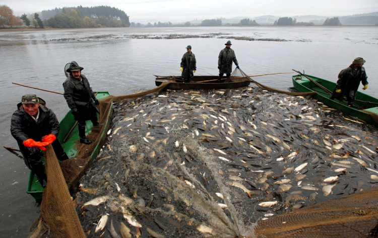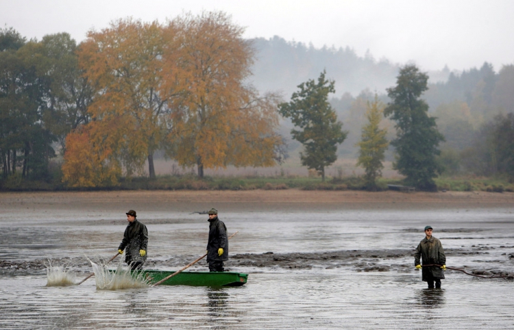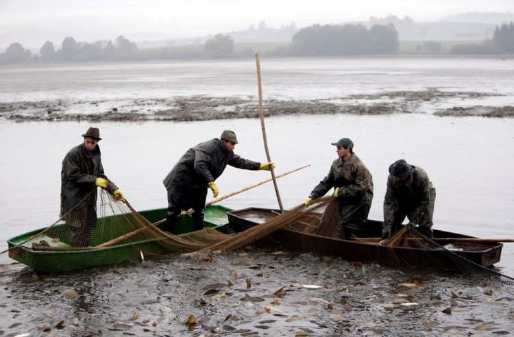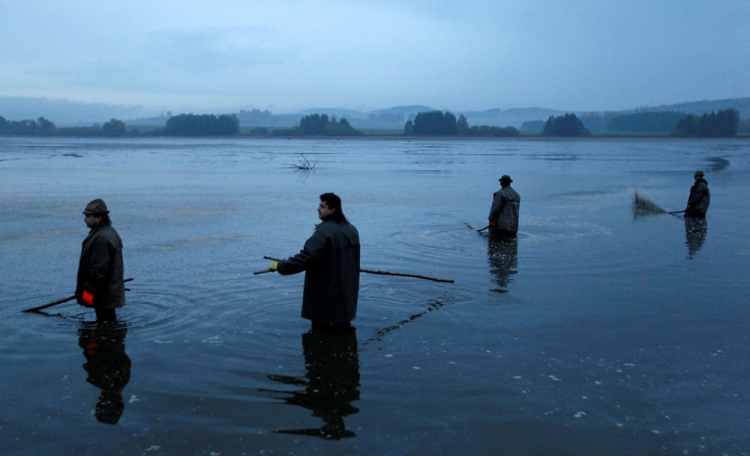 Возле села Belcice, Чешская Республика, на озере Южная Богемия прошла традиционная ловля карпа. Рыбаки используют старинные способы лова, они загоняют рыбу в сети большими палками. Затем рыбу сортируют по размеру и сохраняют живой до Рождества, ведь карп — традиционное блюдо в этот праздник на столе у чехов. Снимки сделал фотограф David W. Cerny 25 октября 2016 года.