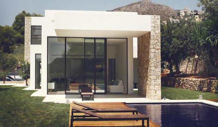 Объёмы меньшего размера имеют только один этаж, и в них находятся зоны, выполняющие общественные функции, такие как гостиная, столовая или кухня, соединённые с садом и бассейном через консольный веранды. Большие призмы имеют два этажа, в них расположены спальни. Заключённое в центральной объёме пространство с двойной высотой потолка замыкает вход и холл. Оно возвышается над другими призмами и выделяет входную зону, отмеченную массивной каменной стеной.