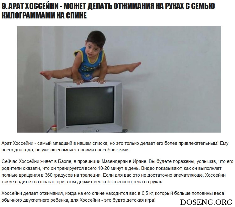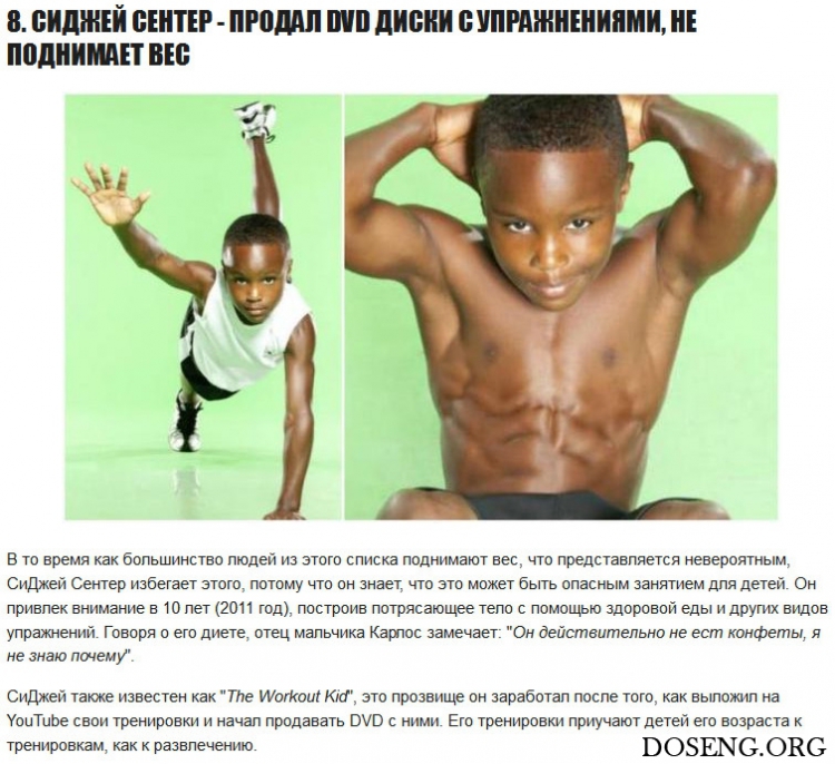 Большинство этих детей начали тренироваться, как только научились ходить. Одной девочке отец одел на руки утяжелители, чтобы она могла качать свои мышцы, будучи еще в детской кроватке! Также в нашем листе есть ребенок, который страдает от заболевания, способствующего невероятно быстрому росту его мышц. Мне это представляется настоящей суперспособностью!