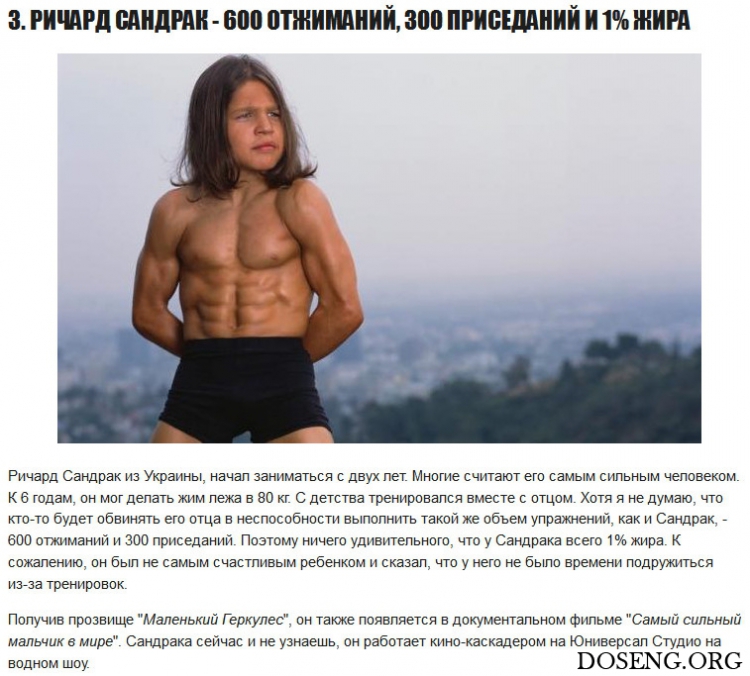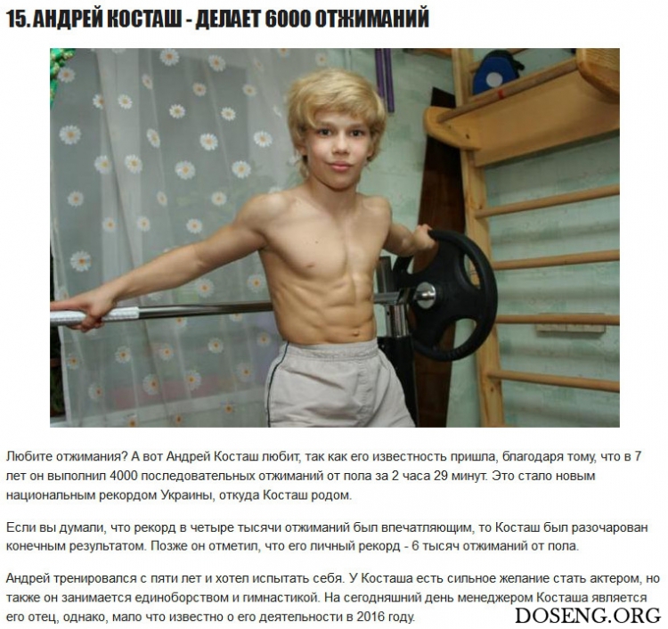 Я и не думаю хвастаться, но иногда могу донести все покупки из машины за один раз. Конечно, это не делает меня силачом мирового класса, однако порой это довольно впечатляюще (в меньшей степени, если я купил всего лишь одну вещь). Но 15 детей, о которых мы поговорим ниже, точно поразят вас своей силой. Мы нашли обладателей мирового рекорда во всех категориях, и если вы думаете, что список включает только мальчиков, вы глубоко ошибаетесь, ведь и некоторые девочки получили звание силачек.