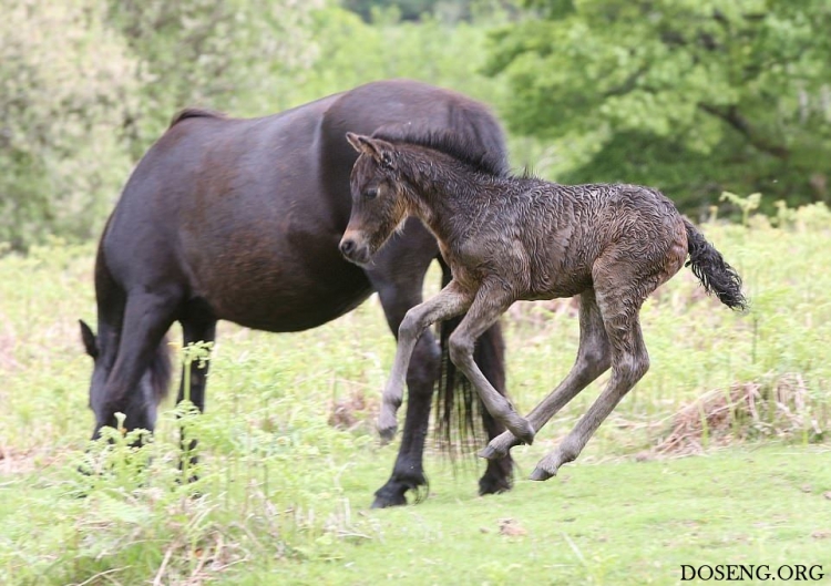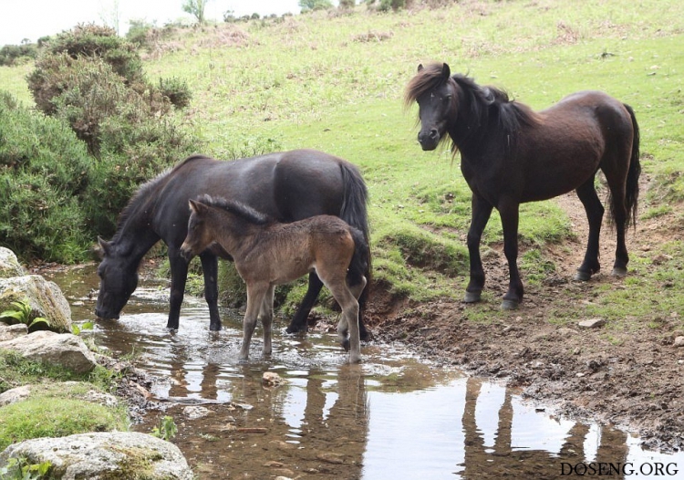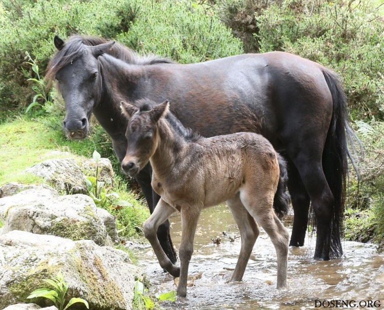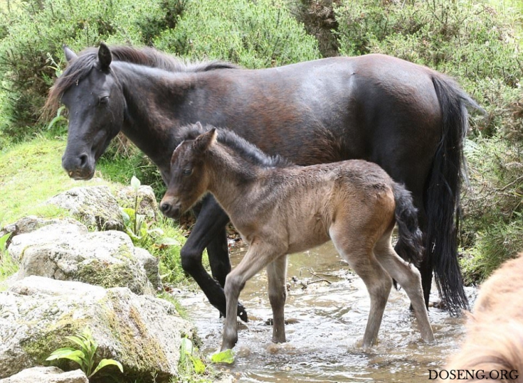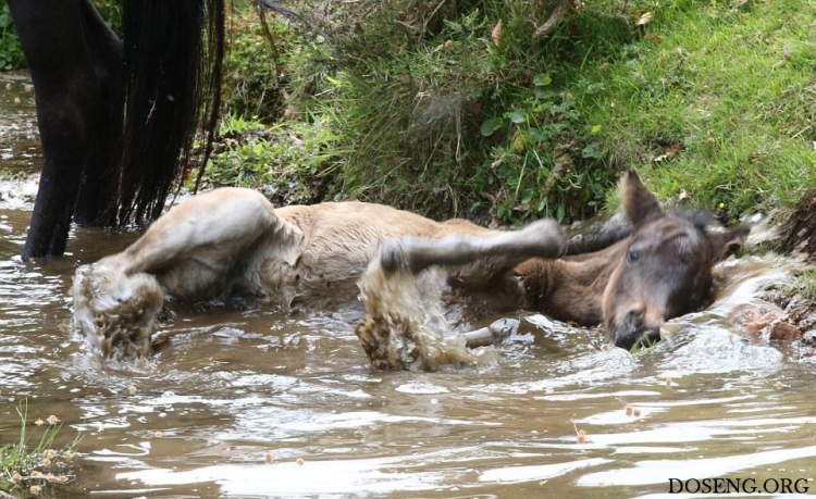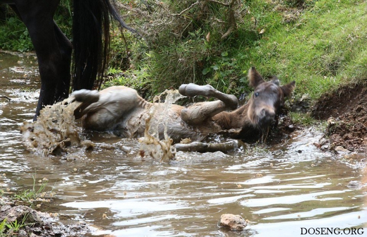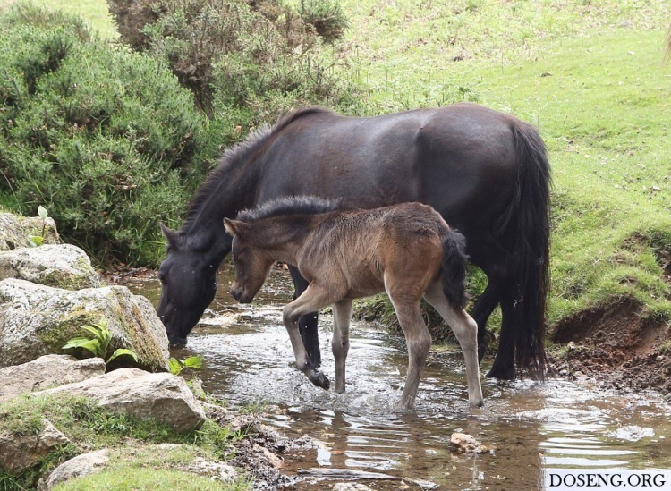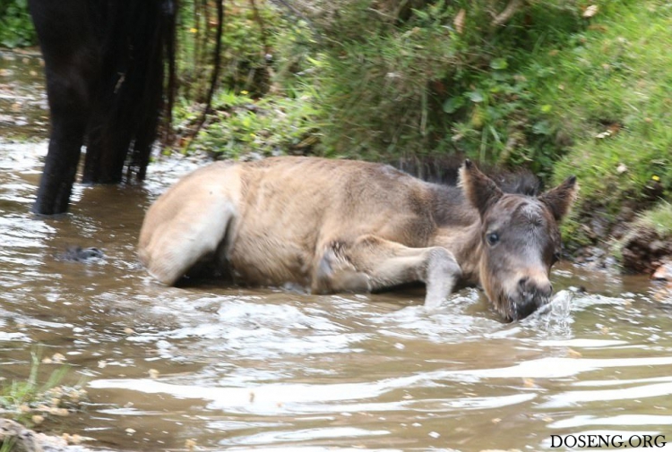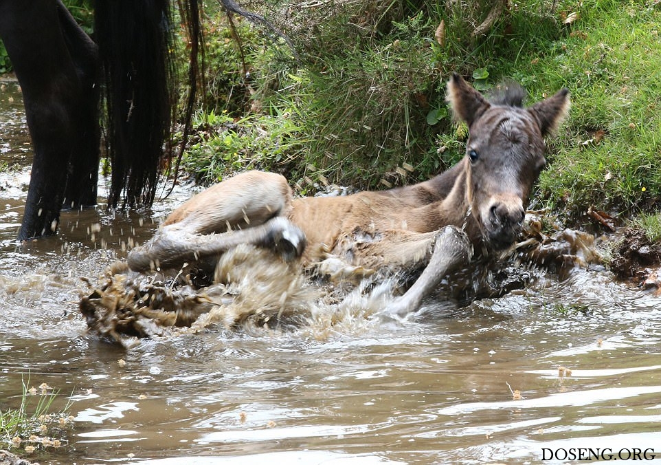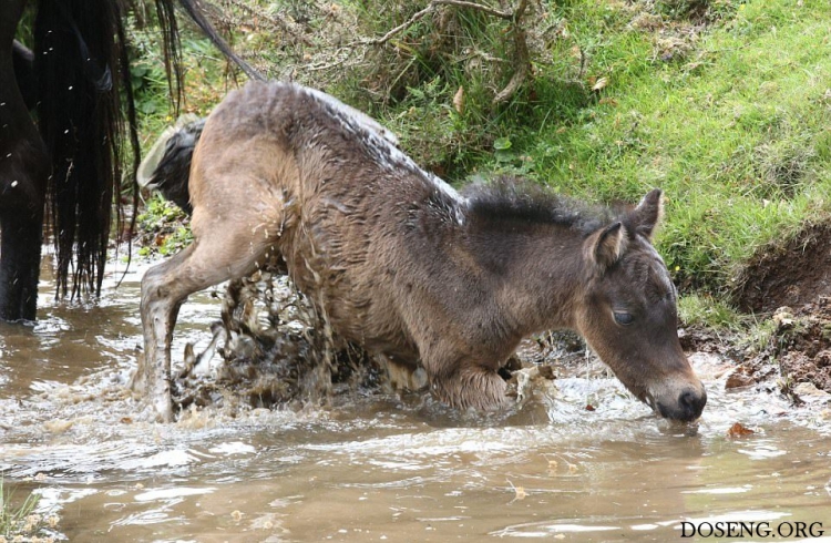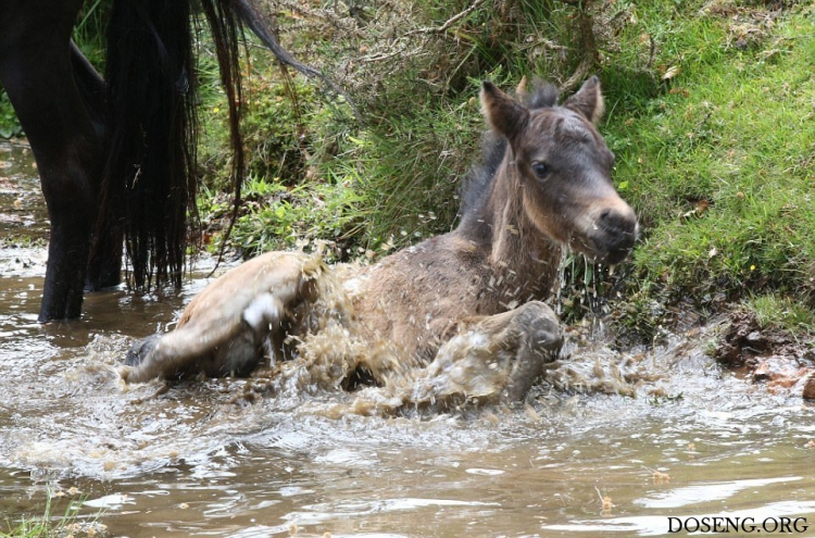 Практически все маленькие животные вызывают умиление, интересно наблюдать как они делают что-то впервые и познают мир. Фотографу посчастливилось снять кадры первого купания в небольшом ручье жеребенка Дартмурского пони, которому всего два дня от роду.