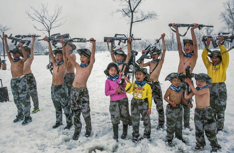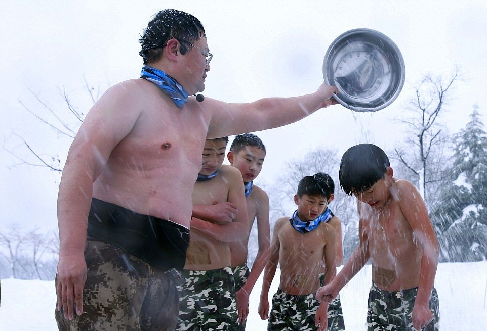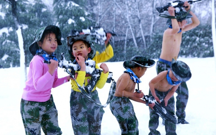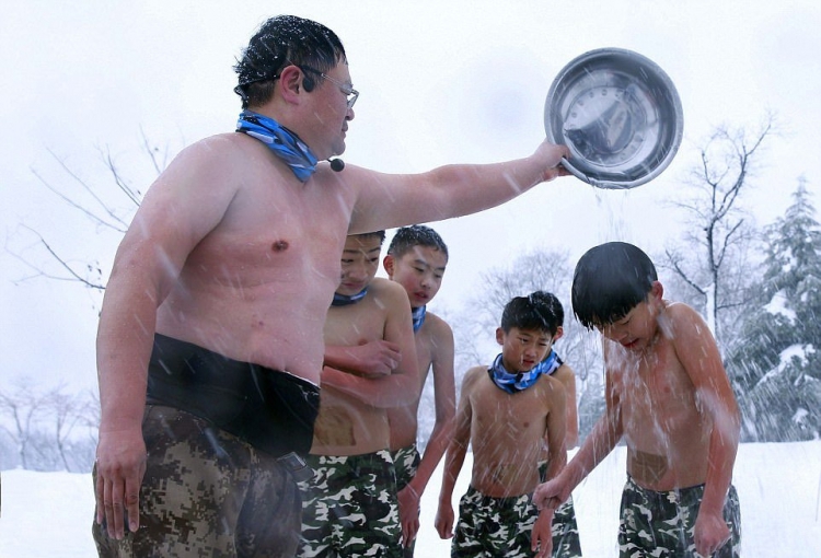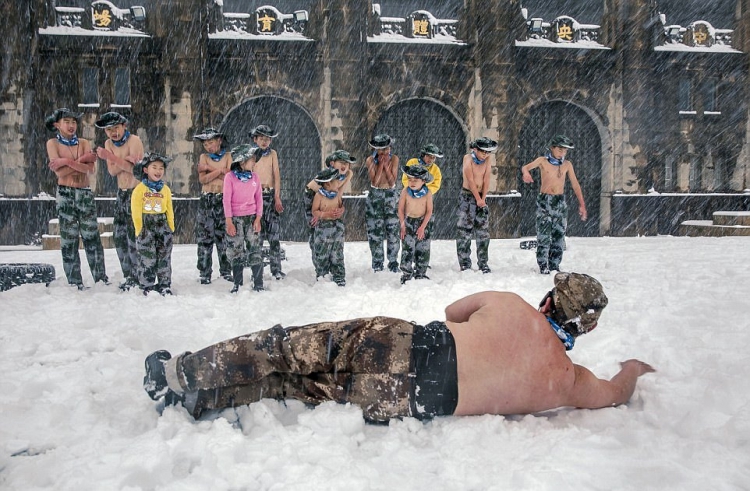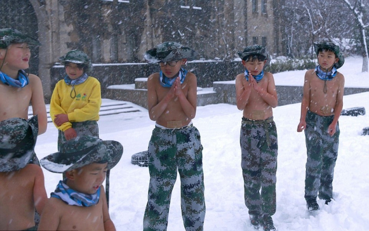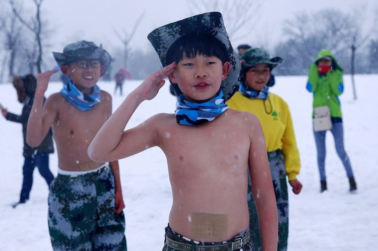 Настойчивый отец из Китая стал известен в 2012 году после того, как заставлял своего четырехлетнего сына бегать по снегу в нижнем белье. He Liesheng по прозвищу "Eagle Dad" (орел-отец) организовал детский лагерь, где ежегодно помогает детишкам закаливать тело и дух. В этом году в лагере 13 детей от 4-х лет, восемь мальчиков и три девочки. Они бегают полураздетые под снегом, обливаются холодной водой, а затем пьют теплый отвар из трав.