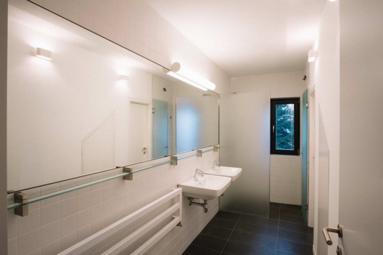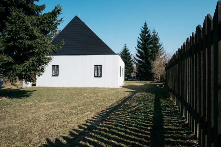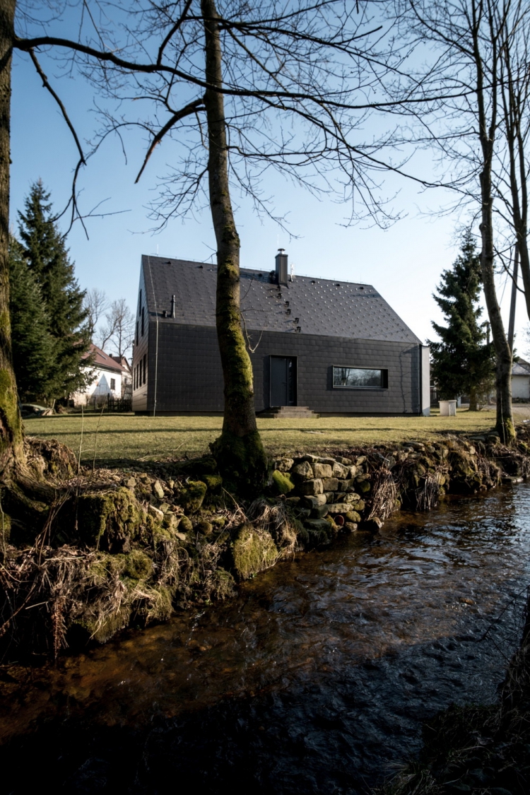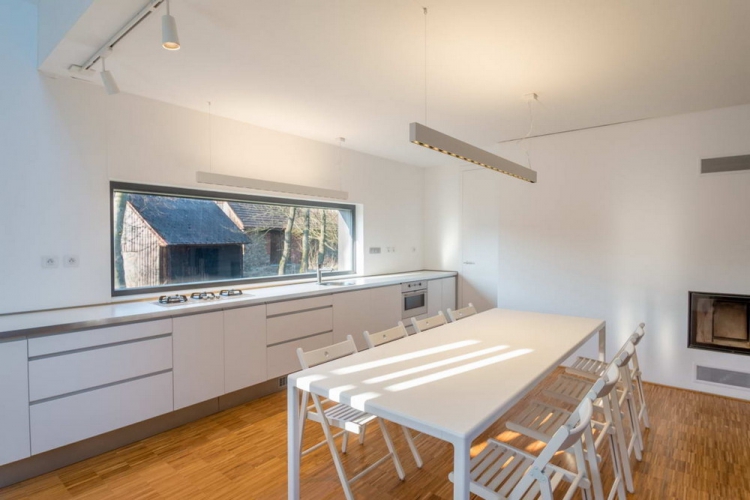 Две белых стены были сохранены как воспоминание о первоначальном здании сельского коттеджа, за ними новая масса дома, которая отличается от старого объемом, формой и цветом. Такой подход позволил чутко объединить исторический комплекс окружающих зданий с современной минималистской концепцией архитектуры. Во внутреннем пространстве также заметно разделение старого и нового. Общее пространство подчеркивается возвышением до фермы, где через большой люк на крыше получает максимум южного солнца. Окно в кухне является основным визуальным контактом с садом. На первом этаже есть гостиная, главная спальня, ванная комната, техническая комната и лестница на чердак, где есть две комнаты с окнами на фасаде и просвет над общей зоной.
