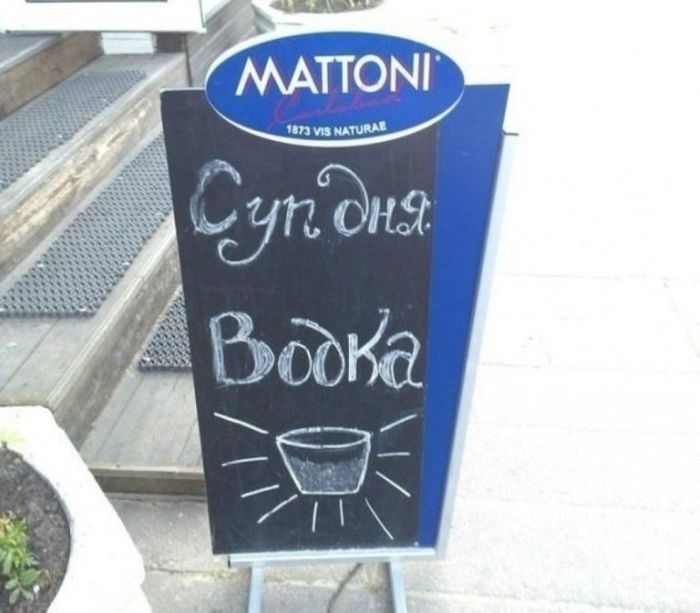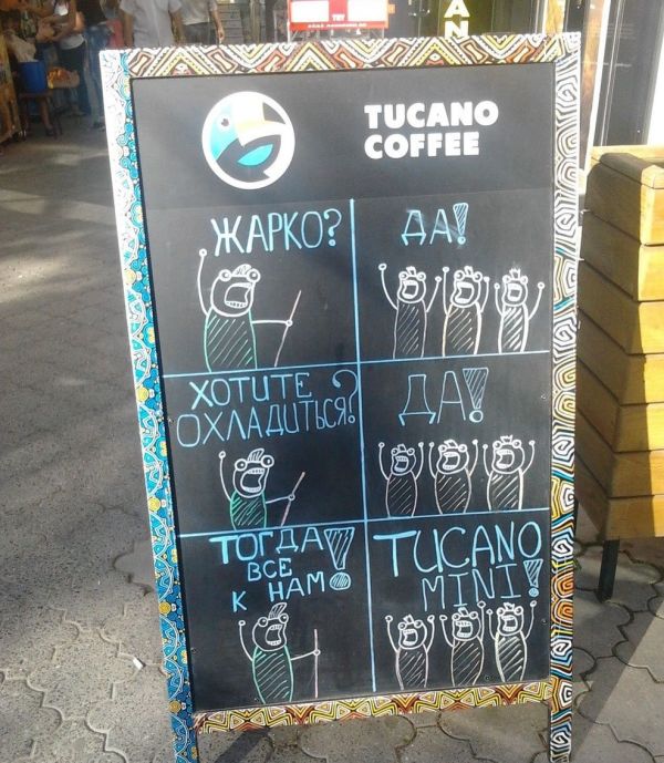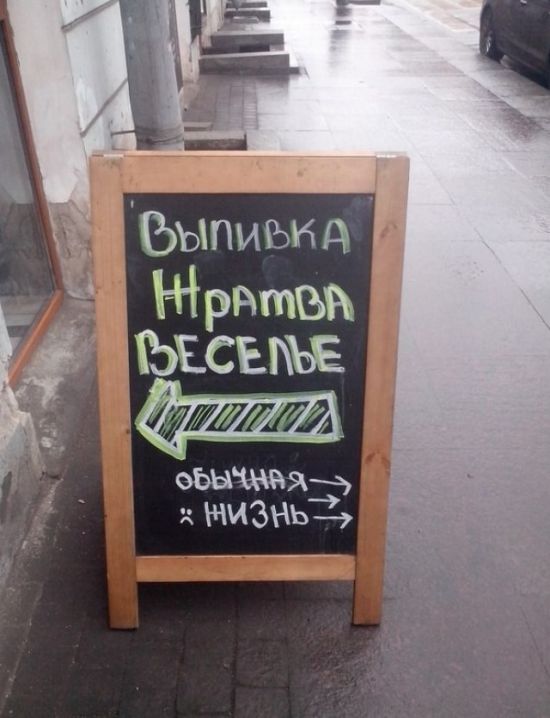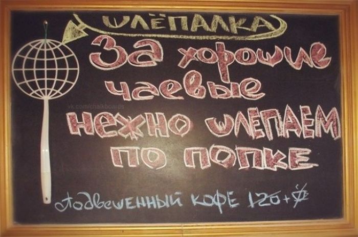 Самописными объявлениями на досках будто внутри, настолько и извне заведений коллективного питания никого не удивишь. Но у владетелей этих кафе всё же вышло привлечь наше внимание, уж больно креативными и оригинальными очутились надписи. Вашему вниманию эти самые созданья «доскоукрашательного» искусства, призванные привлечь будто можно вяще потенциальных клиентов.