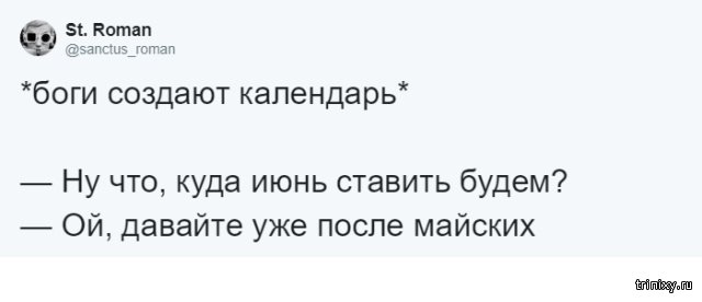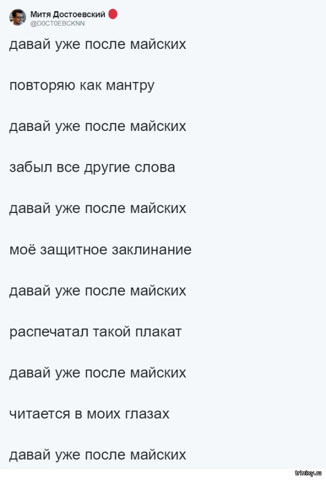 Многие из нас пробуют придумать какую-то отговорку, дабы не ладить те или другие девала напрямик сейчас. Но ныне настал тот самый момент, когда можно передвинуть любое девало итого одной фразой: "Давай после майских", какая даже стала взаправдашним мемом в Twitter. Эту фразу и взаправду можно использовать в любой ситуации.