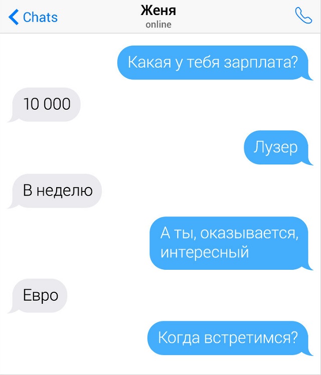 Существуют для люд, для каких переписки - это невеселый процесс. Поэтому они норовят развести подобный внешность общения чем-нибудь забавным. А в этом им помогает их велеречивость и находчивость. В итоге острословы превращают простую переписку в занимательную и забавную игру слов. Предлагаем возвысить себе надвигаться и пробежать переписки людей, какие резки и непредсказуемы в своих ответах.