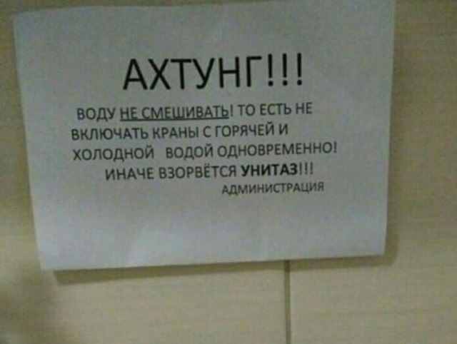 Ежедневно мы видаем на улицах своих городов бездна объявлений, на какие не обращаем никакого внимания. Однако люд, какие катали это, или владеют важнецкое ощущение юмора, или попросту не кумекают, что катают. Например, администрация какого-то заведения выканючивает не вводить ледяную и горячую воду вдруг - иначе может подорваться унитаз. Остальное в посте.