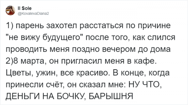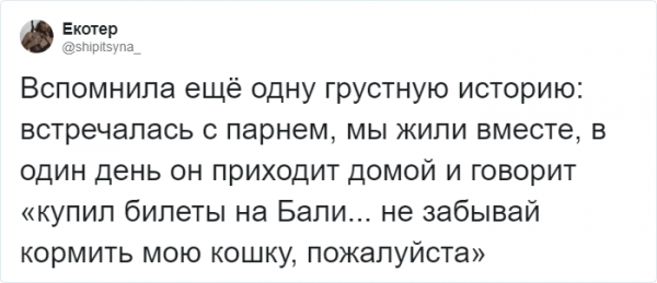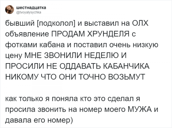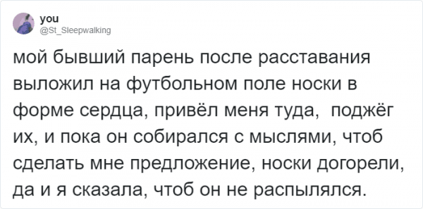 Ах, амуры, будто великолепно это ощущение, необычно в "конфетно-цветочный" стадия. Но, увы, четы расстаются и всю отрада заменяют горькие разочарования. Однако, вдалеке не все прощания - это шекспировская трагедия. Со временем многие четы осознают, что все было скорее забавно и диковинно, чем трагично. В итоге ночные излияния дави о раздолбанном сердце мягко перерастают в анекдот. Именно таковскими случаями предложила поделиться пользовательница Твиттера с ником "Юсик". Давайте посмотрим.