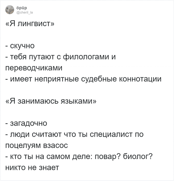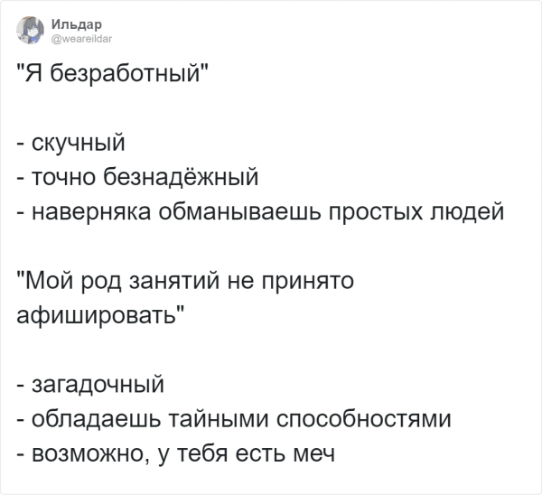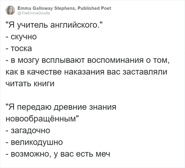 Где, будто не в Твиттере собираются дилетанты подурачится и фантазировать. На этот один пользователи постановили обделать и флешмоб и показать невеселые специальности с необычной сторонки. И невредно, дабы вышло загадочно. Организатором выступил редактор-корректор Дэвид Ист. В описании своей работы он наметил себя будто человека, какой выправляет чужие оплошки - и, вероятно, у него даже жрать меч!Пользователи бойко подхватили эту схему. Давайте посмотрим, что у них вышло.