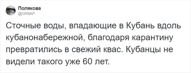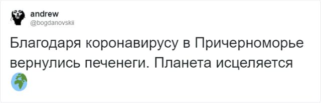 Наверняка вы натыкались на посты, в каких катали о том, что из-за карантина планета становится безукоризненнее. Например, в Венеции вода стала подобный безукоризненной, что даже лебеди прилетели. Безусловно, это важнецки, а мы бедствуем в позитивных новинках. Но пользователей Твиттера ничем не взять. Они могут подсмеиваться над чем угодно. Соцсети полнятся шутками про "минусы" коронавируса, а ныне настала очередность пошутить о его "минусах".