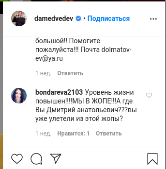 Вы когда заглядывали в Instagram нашего бывшего премьера?Нет?А зря, там больно бессчетно забавного. И, будем честны, будет правдивого. В комментариях к постам Дмитрия Медведева люд выкладывают все, что вообще о нем кумекают. Интересно, а он знает о функции "запретить комментарии"?