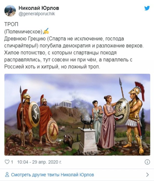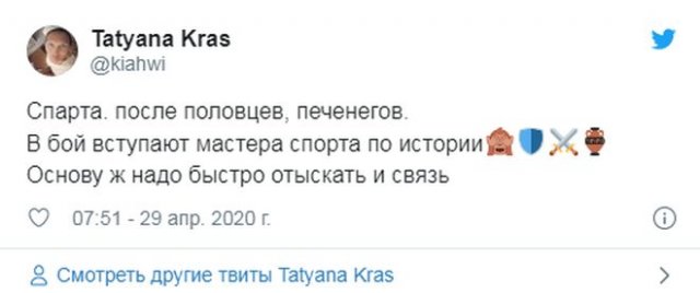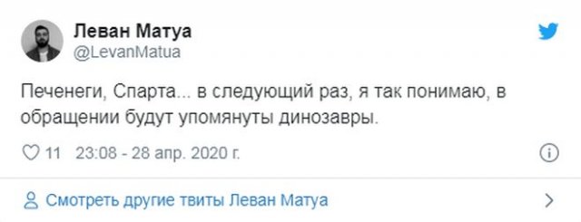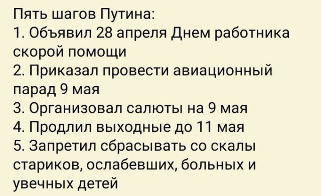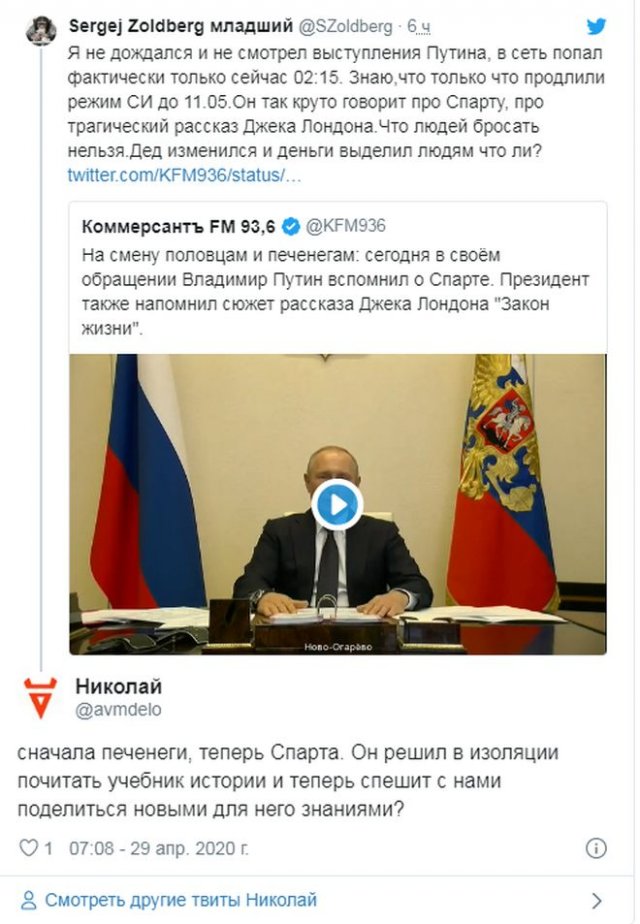 Судя по всему, российский президент Владимир Путин где-то откопал несколько учебников истории, поскольку в всяком его обращении жрать ссылки на темы, какие вообще никак не глядят ни к пандемии коронавируса, ни к ограничительным мерам, заведенным во многих городах. Раньше были печенеги и половцы, а ныне Спарта - и ни слова о том, что его "нерабочие дни с сохранением заработной платы" утилитарны не вкалывают. Многие до сих пор остаются без работы и денег, а кое-каким мамам доводится вылезать и выканючивать милостыню.