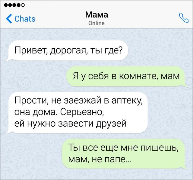 В жизни всякого родителя настает пора, когда их детки вырастают. А это значит, что отныне с ними можно болтать на равновеликих. Следовательно, мамы и папы перестают брезгать саркастичных и ироничных приколов. Давайте посмотрим подборку забавных переписок с родителями.