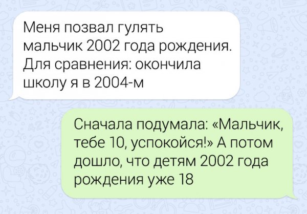 Многим людам до сих пор будто, что люду, какой родился в 2000-м году, сейчас надлежит быть много лет 5-6. Но если протереть бельма и вглядеться в месяцеслов, реальность выливает нам на голову ведро ледяной воды. Жизнь летит с запугивающей скоростью, однако не стоит болеть. Лучше итого глядеть к этому с юмором, будто авторы этих шуток.