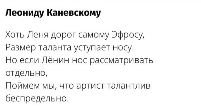 12 декабря загнулся знаменитый артист Валентин Гафт. Мы знаем его по ролям в кинофильмах "Чародеи", "Мастер и Маргарита" и многих иных. Он также был звездой "Современника". Но кроме актерского таланта, Гафт прогремел будто артист эпиграмм, какие катал о людах, себе и коллегах. Они изощренные, забавные и больно аккуратные. Вот несколько из них. P.S. Кстати, в былом месяце ретировался из жизни Михаил Жванецкий - тут можно посмотреть важнейшие цитаты великого сатирика.