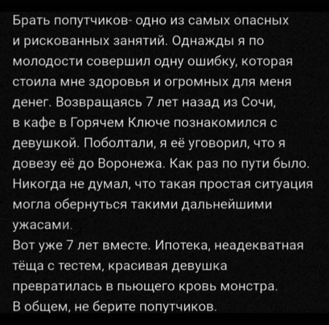 В этой подборке также жрать уморительная история от взаправдашнего мужика, какой зачем-то взял попутчика. И, безусловно же, чистосердечное признание от того, кто затерял боготворимую.
