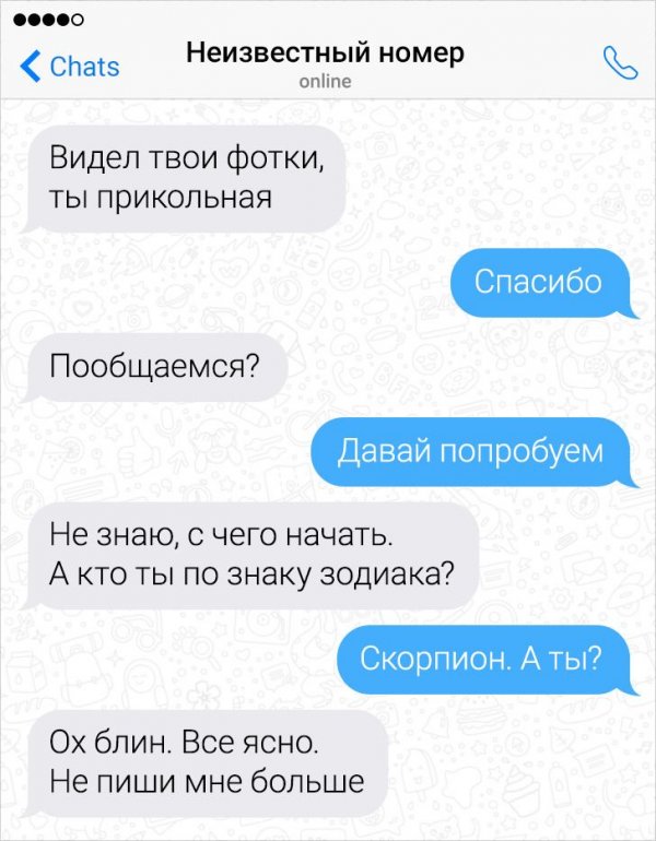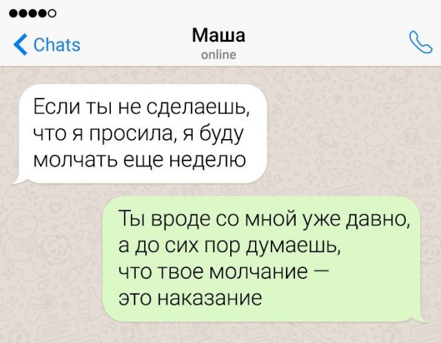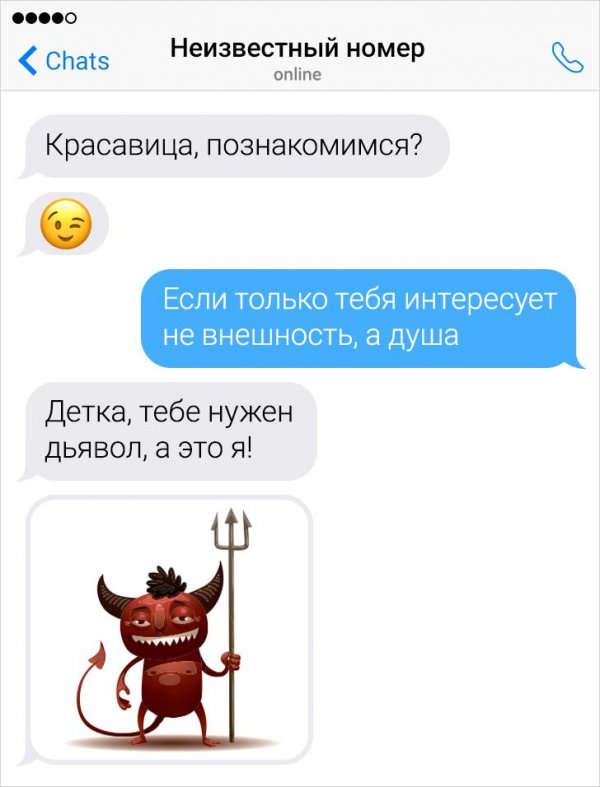 Далеко не всякий человек может похвастать цицероновским велеречием. Поэтому многие люд предпочитают водиться в мессенджерах, дабы освободить себя от неповоротливых пауз и прочих конфузов. Но и при переписке можно наткнуться на острословов, извещения каких надолго запомнятся.
