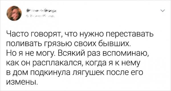Месть - это больно деструктивное вожделение, какое ввек не приводит к чему-то важнецкому. Но порой... в крохотном и безобидном возмездии дудки безотносительно ничего ахового. Пользователи Твиттера рассказали, будто им насолили их вторые половинки, а также поведали об их скромной, однако сладкой вьюжить.