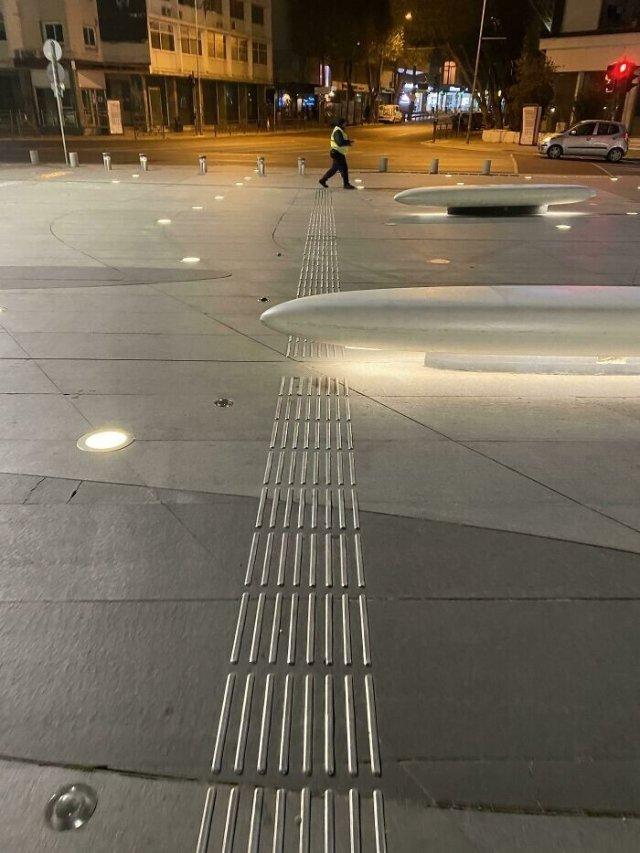 Тактильная плитка для слабовидящих упирается в бетонную скамью.