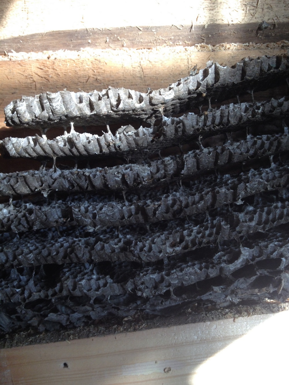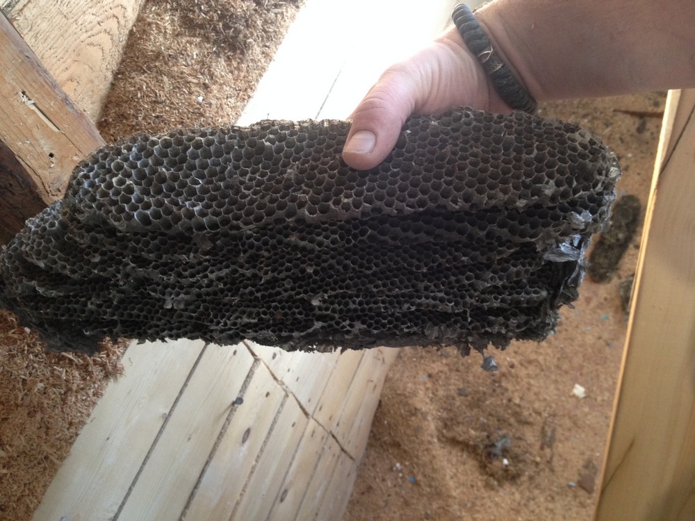 Сегодня был у товарища, он разбирал часть стены в кухне с целью перепланировки оной в последствии (дом частный). Когда оторвал одну из досок, сверху выпало нечто... Т-щ протягивает мне ЭТО и говорит: "Хорошо, что сейчас зима, а не лето. А то бежали бы дальше, чем видим!".